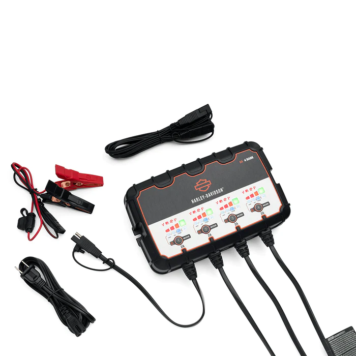 Keep all your bikes fully charged and ready to ride. This fully-automatic 4-bank Harley-Davidson Dual-Mode Battery Charger is perfect for short- or long-term motorcycle battery charging needs.