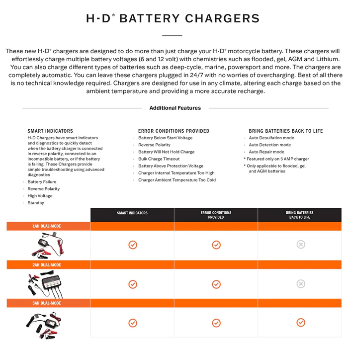 - Selectable charge options provide optimal charging for Harley-Davidson Lithium LiFe or AGM Lead-Acid batteries