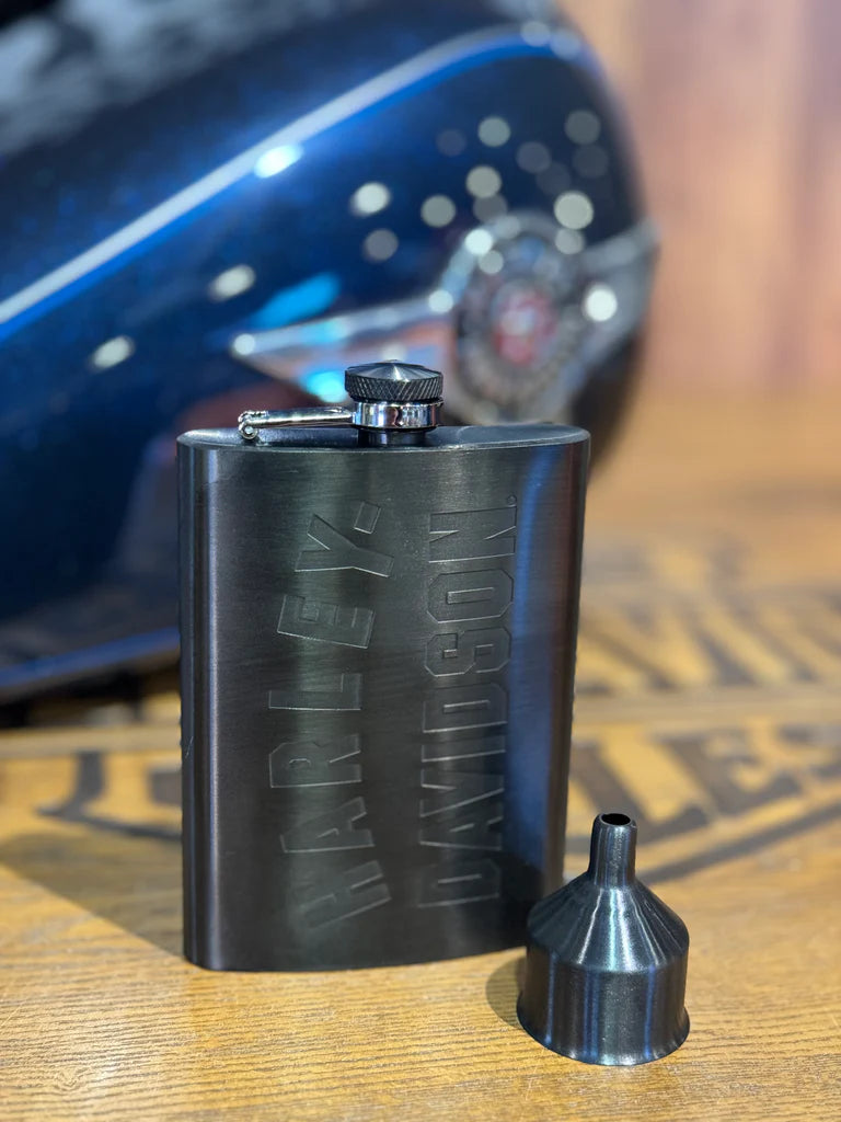 Harley-Davidson® Matte Black Flask, HDX-98657. Size: 8 oz. Matte black stainless steel flask. Embossed Harley-Davidson® logo on flask. Includes easy-fill funnel with Open Bar & Shield logo. Dimensions: 3.75" W x 5.5" H x .75" D.