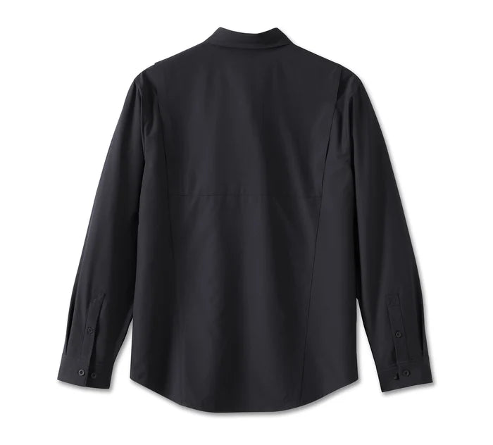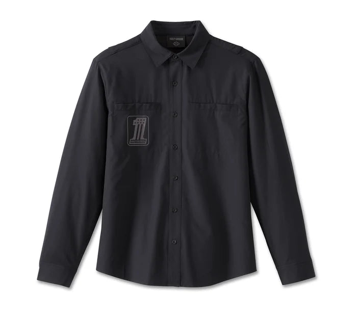 Keep your Harley-loving style without overheating in our #1 Performance Vented Shirt. It’s designed with a mesh back panel plus a moisture-wicking blend of polyester and spandex ripstop to help keep your sweat situation non-existent. This men’s long sleeve shirt is finished with a hint of our branding for an understated Harley-Davidson™ look that’s ideal for work, weddings, or date nights. Fun fact—the #1 Logo featured here originally debuted in 1969 to mark our AMA Grand National Championship season title.