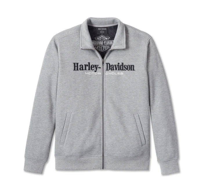 Casual comfort for the Harley lover on your holiday list is here…With a fuzzy warm Sherpa inside and textured waffle outside, our Darting Zip-Up Sweatshirt is an ideal cold-weather layer. This zip front men’s cardigan-style sweatshirt features hand-warmer pockets with hidden snaps, plus rib-knit cuffs and hem to help keep its shape. Finished with our most iconic logo embroidered on the back and our seasonal graphics filling the front.