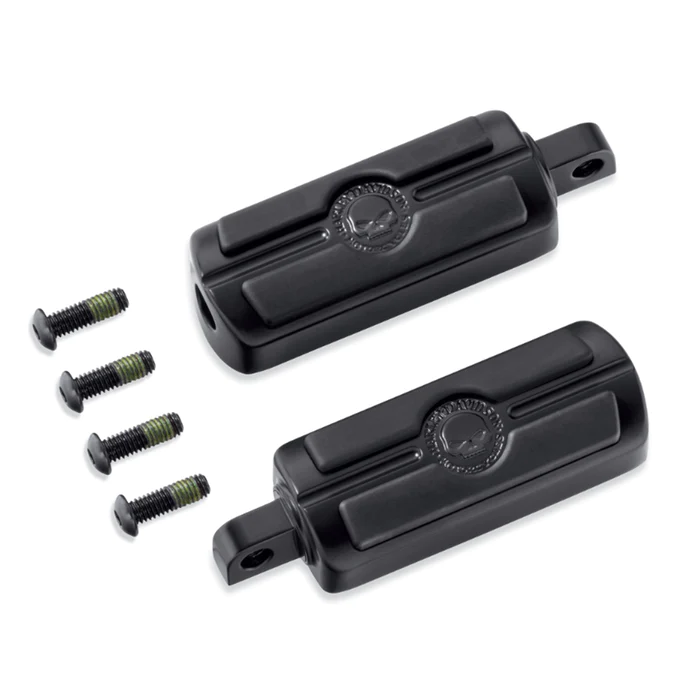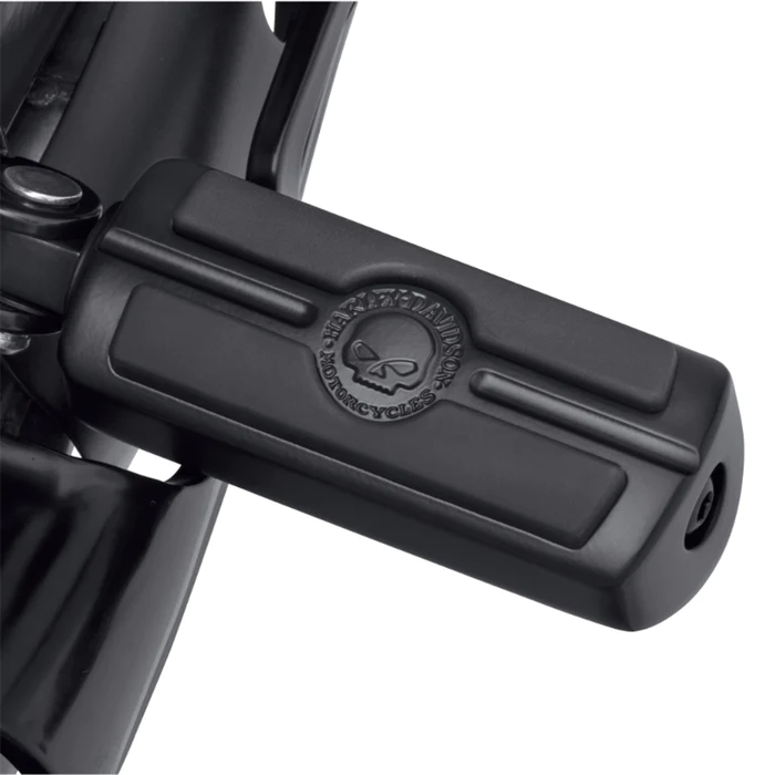 Styled to complement other Willie G Skull Collection Accessories, these obsidian black Footpegs feature a raised Willie G Skull and Harley-Davidson Motorcycles script surrounded by rich black rubber for grip and traction.