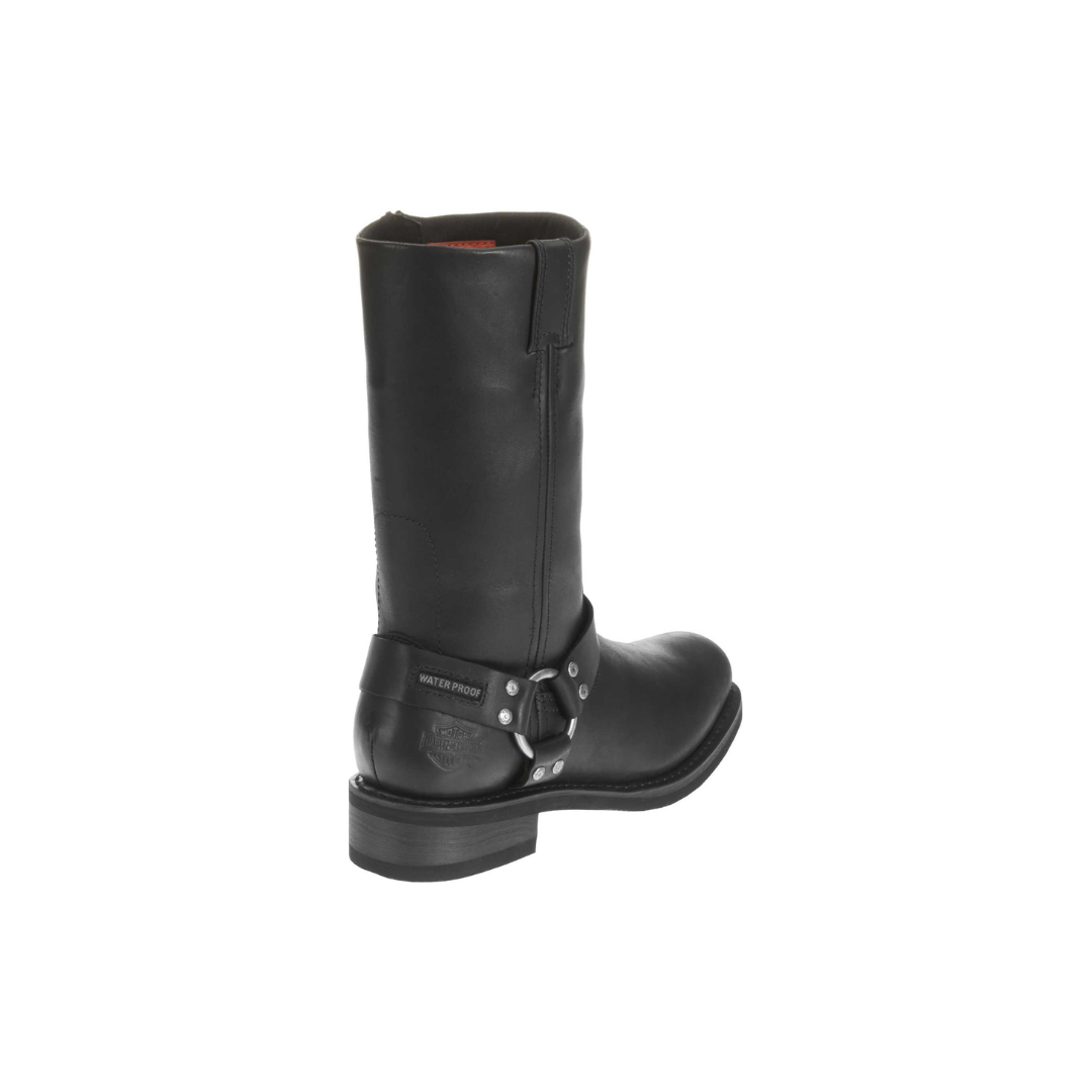 Looking for that one classic pair of motorcycle Riding Appropriate harness boots? One that is waterproof? How about a pair you can actually wear riding? You've found the Harley-Davidson® Hustin. Harley-Davidson® Men's Riding Appropriate waterproof black leather motorcycle harness boots. Classic styling with a front and back cross-strap and attached O-ring. Uppers made from full grain leather with an oil-resistant rubber outsole. The boot features a comfortable full-length soft cushioned lining affording hours of fatigue-free wear. Shaft height: 11", Heel height: 1.5". The boot's sole, insole and upper are bound using resoleable Goodyear® Welt construction processes, adding years of use with proper care. Manufacturer Part Number D95353.
